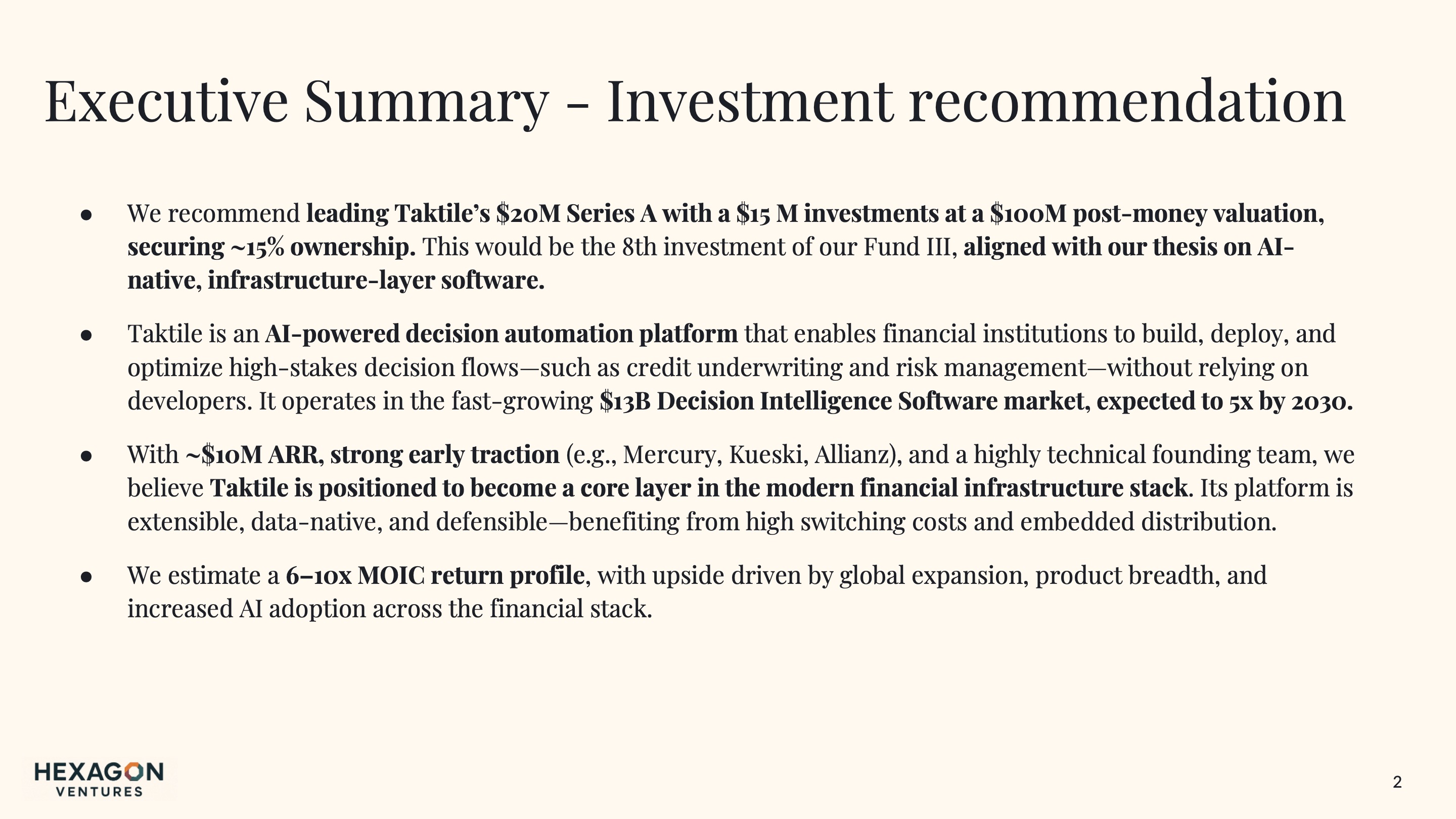 In this competition, our team of 6 presented a mock fund thesis, strategy, and investment criteria, and recommended an investment in Taktile—an AI-powered decision automation platform for financial institutions to build, deploy, and optimize high-stakes decision flows.